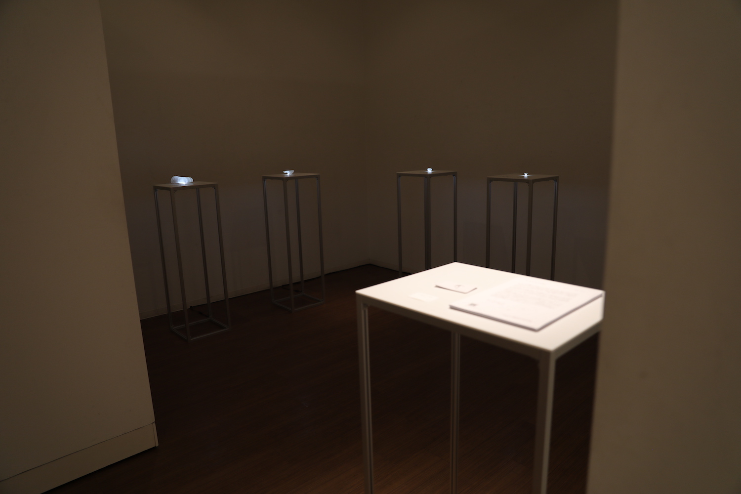 そこで本作ではコントロールの対象と数式を組み合わせて展示します。17世紀のスイスの数学者 ヤコブ・ベルヌーイが再帰的な曲線として示したベルヌーイの螺旋アルゴリズムを利用してアンモナイトを模倣した造形を出力し、それをコントロールの対象としています。また307フレームまでシミュレーションを行い、その断片として、4つの造形を配置しています。